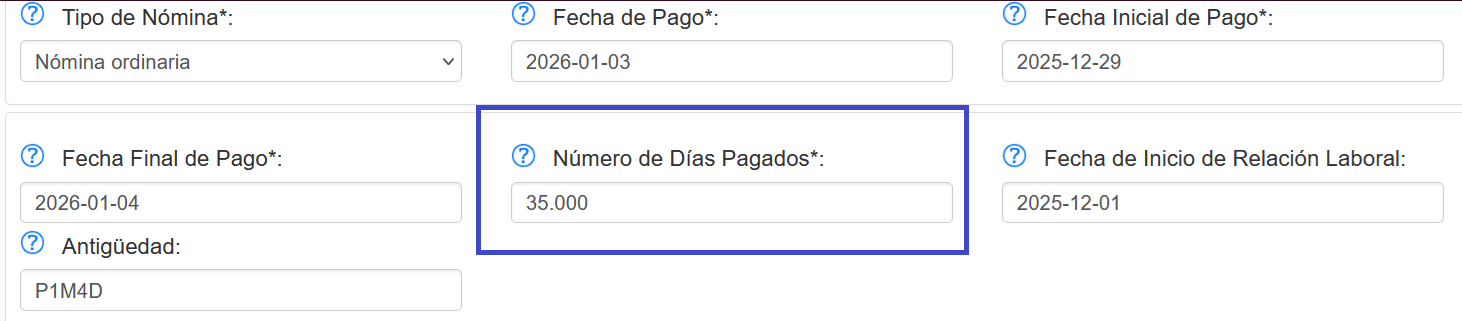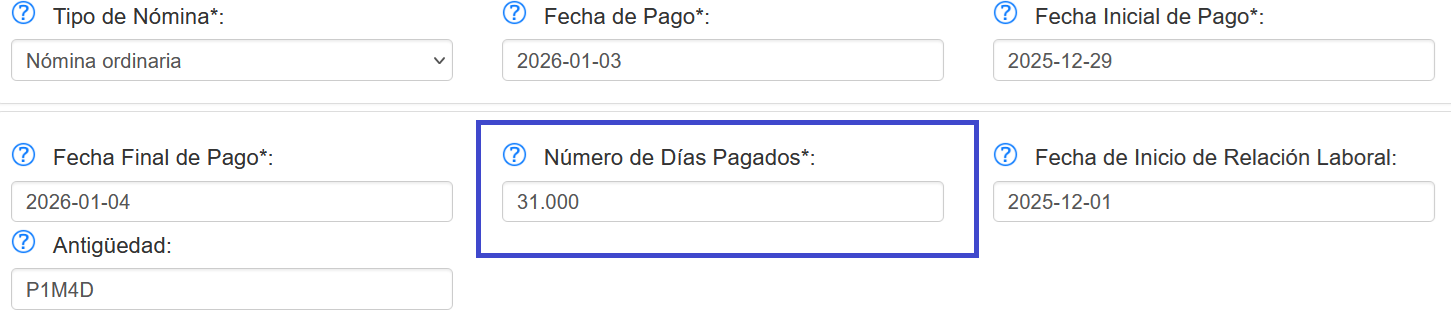 Para reforzar lo antes mencionado, el día de hoy 07 de enero de 2026, en el portal del SAT se realizó el llenado de la nómina con una prueba con 31 días como se muestra en la siguiente imagen;