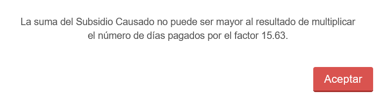 | Validar | El valor registrado en este atributo deberá ser menor o igual a 628.00 cuando el valor registrado en el atributo NumDiasPagados es menor o igual a 31. El valor registrado en este atributo no debe ser mayor al resultado de multiplicar el factor de 20.66 por el valor registrado en el atributo NumDiasPagados, siempre que este último sea mayor que 31. |